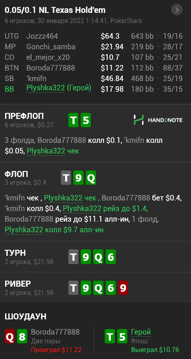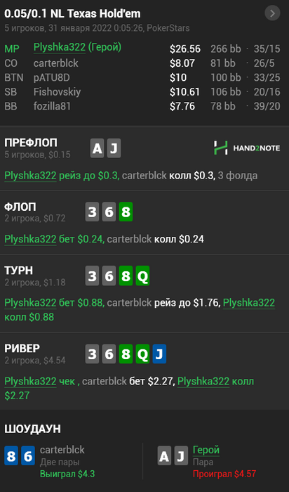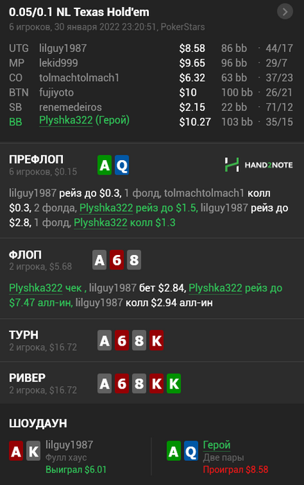 Plyshka322 @ 26.01.22Лимп AQo от фиша, не ожидал: