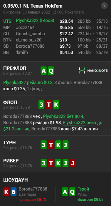 Примерно против такого же оппа была раздача, на структуре A77 и что-то там еще в лимп-поте с ним попал в трипс с K7 и отдал ему стек против его AA, причем на ривере. Никак не ожидал там увидеть ракеты, тем более с двумя чеками на флопе и терне. Как можно в таком мелком банке отдать стек? Это называется Могу, умею, практикую