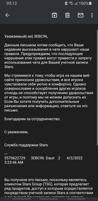 Для того, чтобы я не "манипулировал скринам", я дождался когда старзы пришлют мне мою историю чата, моего собеседника отказались, но есть первые 5-6 скринов.