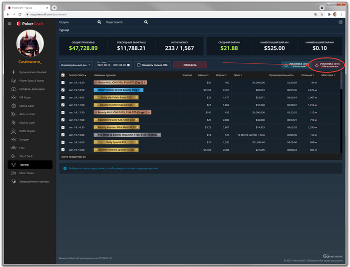 3) выбираем турниры по диапазону - рекомендую брать по одной неделе, так как он не может скачивать более 10 тыс.рук.
