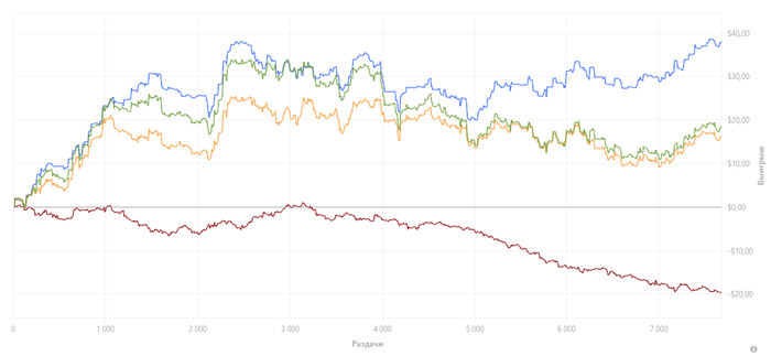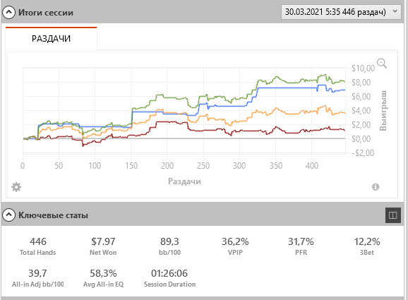 Переап опять, получил в 2 раза больше, чем по ев. Ну это по итогам всего то 446 рук. Это вообще ни о чем.