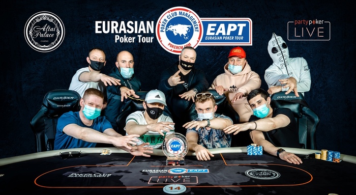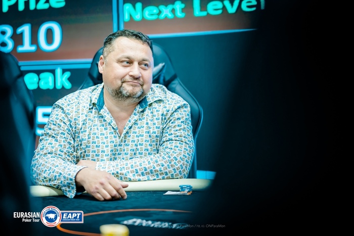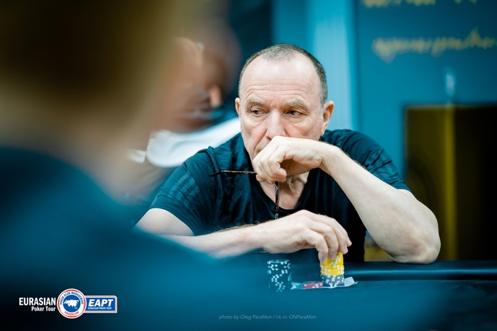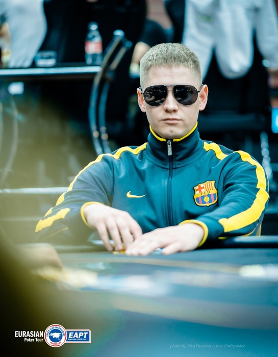 Мухтар Насирадинов сыграл комплитом, Виктор Мухин прочекал большой блайнд. На флопе Мухтар поставил 30,000, Мухин переставил до 110,000, получив колл. На тёрне Насирадинов сыграл чек-колл 120,000 и донкнул 200,000 на ривере . Мухин пересчитал стек и сдался.