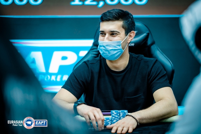 Следующую Мухтар открыл рейзом 25,000, Пушкарев задвинул олл-ин и получил колл. На этот раз всё не так хорошо для короткого стека.