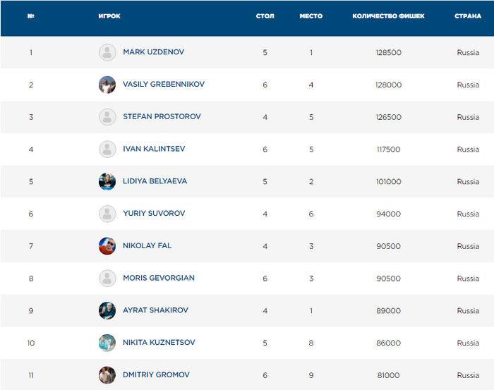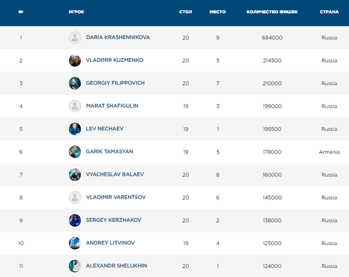 Саид Гопия запушил 245,000 со средней на , Алексей Савенков сделал колл на малом блайнде с . "Такую бы не выкинул. А пятёрки - выкинул", - сказал Виталий Панков.