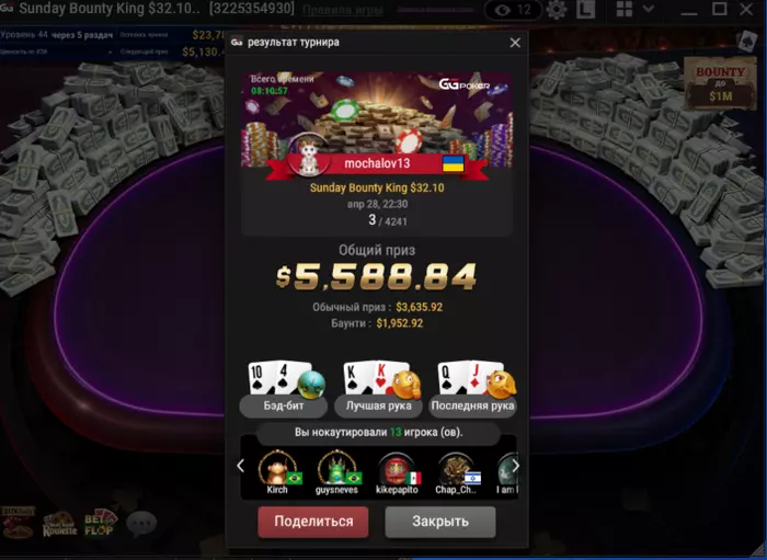 Вирішив викласти цей занос. Хоча це і не бест кеш і мої лише 10%, але, якщо не помиляюсь, то це перше моє ТОП1 в турнірі за 1000+ доларів!