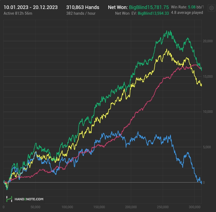 2) Часть декабря – Январь- часть Февраля. Параллельно теории и разборам раздач отключаю ВСЕ верхние лимиты нл400-1к, оставив только нл200, чтоб снизить влияние стресса и усваивание теории было более гладким. Чувствую плоды такого подхода, осмысленных раздач все больше, задумки\мувы\чтение оппов чаще прокают, уверенность потихоньку возвращается, решаю обратно подключать 400-1к.