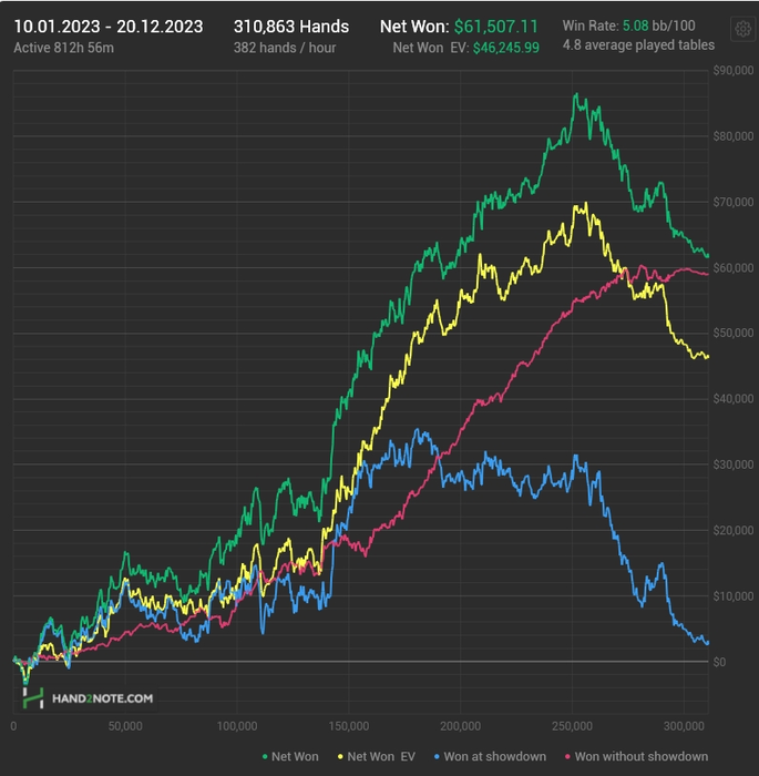 чтобы рыпаться куда-то на нл2к или отключать нл200 и стремиться играть онли нл500-1000 и в общем разными путями повышать свой средний рабочий лимит - решил засейвиться на данном этапе пути, не рисковать больше такими деньгами и купить дом. И прям на следующий же день после вывода денег рубильник резко переключили и за столами начался полный ад, в результате которого я даже принял решение спуститься на комфортные для психики те же нл100-200, откуда и начинал год. Помощь пришла откуда не ждали и биток как раз с октября начал активно расти и нивелировать мои заливы за столами, так что капитал в общем то не просел.