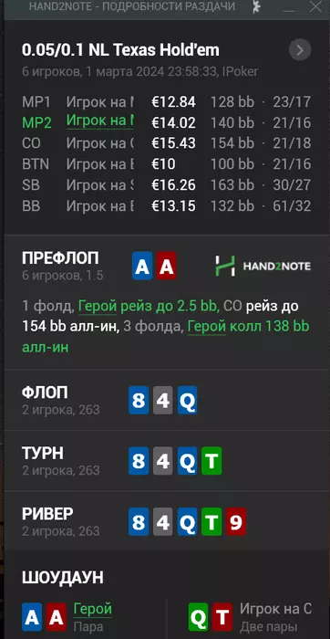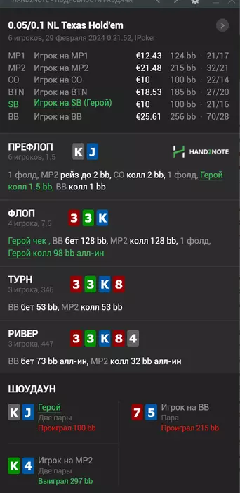 Вот это была болезненная раздача, я понимал, что у випа эни ту, а вот рег отбил его с любым Кx... Мой колл был норм, просто там динамика за столом была такая и люди заводили за 2бб любые карты.