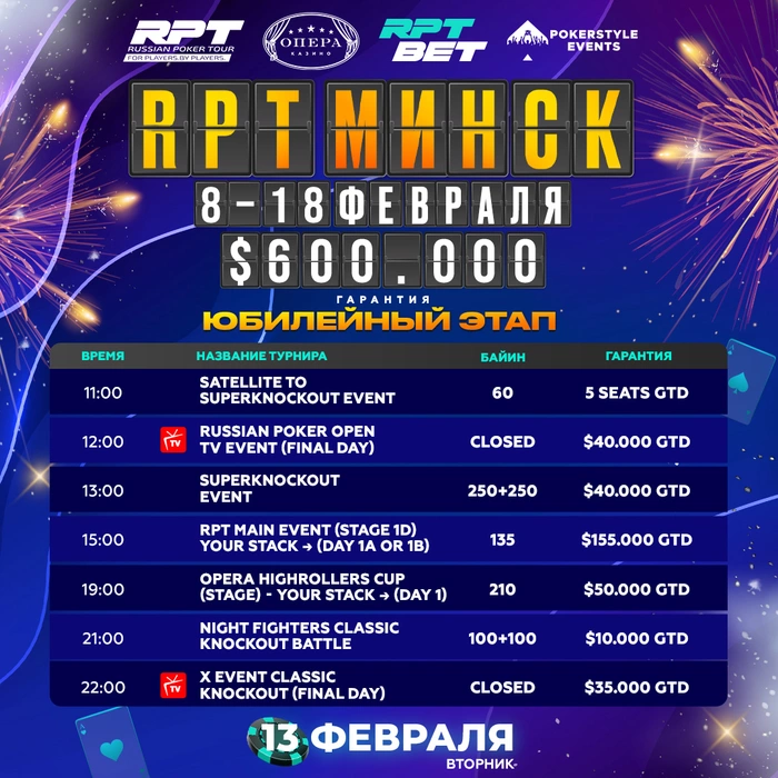 В день-экватор Russian Poker Tour предлагает сыграть 7 турниров на выбор: