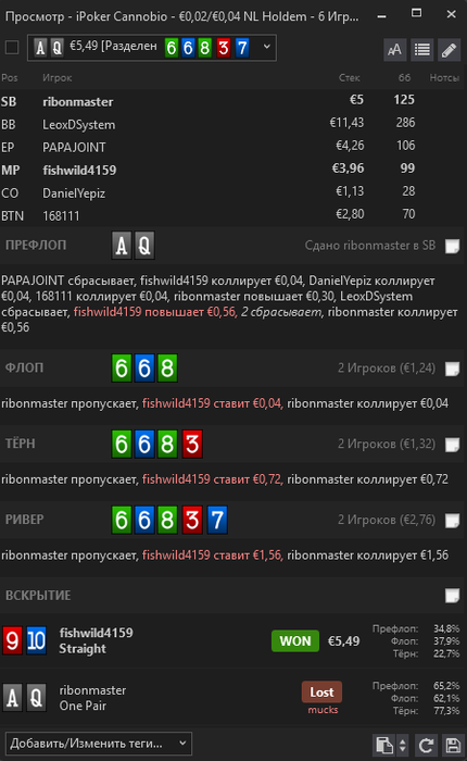 Игрой доволен. На пд мог лучше отыграть, в бомбпоте выставился с оверпарой в допер. Доска не спарилась, сет не наловил. Да и в целом достаточно агрессивные фиши играют. Будем подстраиваться.
