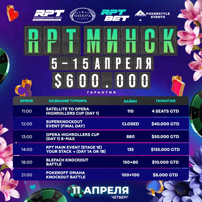 🕚 В 11:00 пройдет сателлит к турниру хайроллеров — $110 Satellite to Opera HighRollers Cup (Day 1) (4 seats GTD).