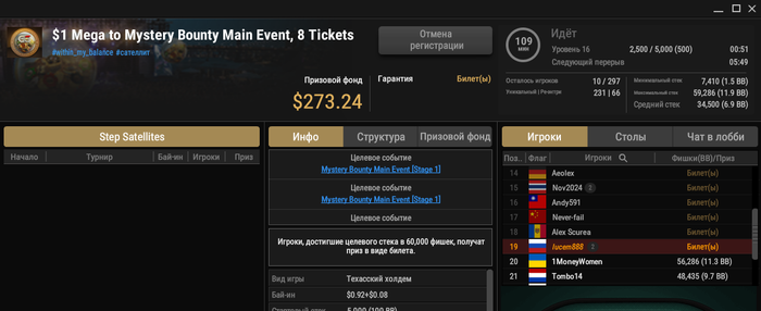 Давно не играла сателлиты в лудильне, а тут смотрю - серия началась. Ну и решила сат сыграть на Мистери Баунти. Сижу играю, получается 25 билетов. Когда осталось около 50-ти человек, я стала играть по стратегии обычного сателлита, так как была уверена, что билет уже мой. И вот остается 25 человек, но турнир не прекращается. Сижу нифига понять не могу. Полезла в лобби. Оказывается эти долбонавты придумали целевой стек и билет достается не тем, кто попал в топ 25, а тем, кто в топ 25 наколотил целевой стек 60 000 фишек Ну вот здесь без матов ну вообще никак... Но не буду... Но вообще никак... Билет получила, но осадочек такой себе