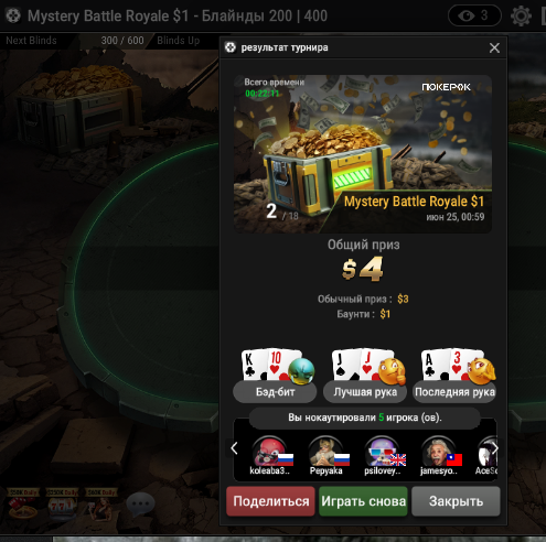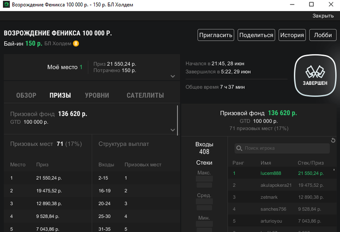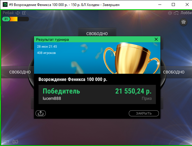 Запланировала сыграть этот турнир на через день после сата. И вот наступил тот самый через день. Загрузка 6 столов, везде все хорошо и очень хорошо, и тут в 22-30 выключают свет... Обидно было не столько из-за общей загрузки, а сколько из-за того самого турнира, в который через сат попала. Через час свет включили, запихала оставшиеся огрызки и пошла спать.