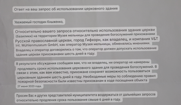 Ответ дал Stadtbaurat - в Германии это высокопоставленный чиновник в городской администрации, который отвечает за строительство, архитектуру, планирование и развитие города. Из этого ответа стало известно, что здание храма (они называют Базилика, как архитектурный тип храма) находится в собственности города Гифхорн, а оператор (тот, кто непосредственно хозяйствует) фирма V&T Int. Mühlenmuseum GmBH. Также они допускают проведение богослужений прихожанами Русской православной церкви 6 раз в году. Кроме этого, указано на необходимости соблюдения мер пожарной безопасности (вот почему свечи электронные в храме), а также просьба в дальнейшем воздержатся от дальнейших запросов относительно продления срока Богослужений свыше 6 дней в году.