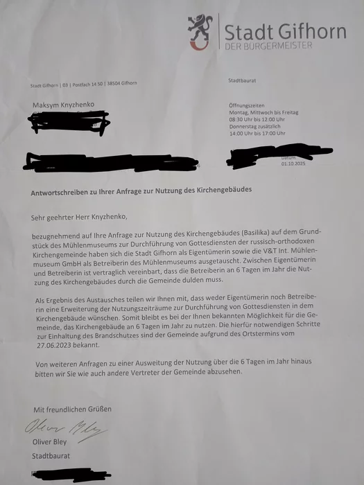 Пришёл ответ на этой неделе от города Гифхорн на мое письмо им по поводу просьбы разрешить проводить православные службы в храме Св. Николая Чудотворца. Ответили достаточно быстро, в этом большой плюс немецких государственных органов, кто бы что не говорил за немецкую бюрократию (29 сентября написал, 1 октября дали ответ)! И не побрезговали ответить даже мне, как меня обзывал Мефистофель - "бланковой карте". Всё-таки приятно, когда тебя слышат (читают) и есть диалог между чиновниками и простыми людьми, даже не гражданами Германии.
