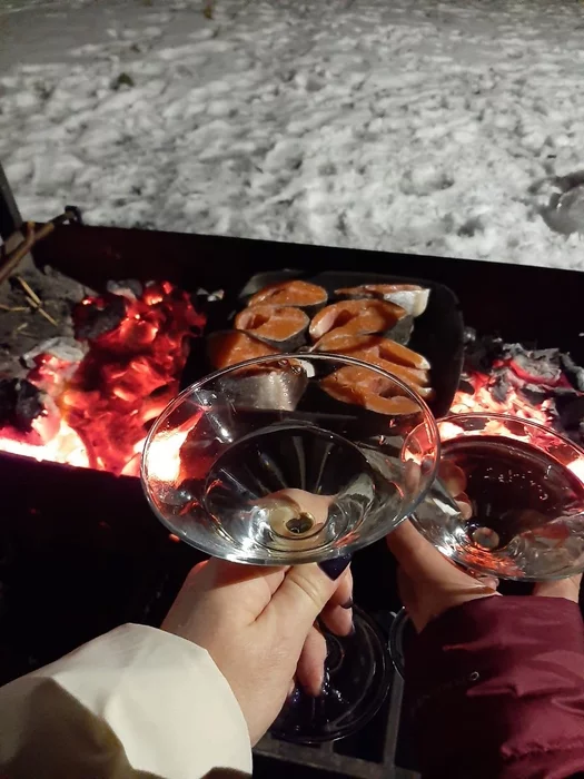 Куранты, открываем шампанское, поедаем вкуснейшую и нежнейшую рыбу, салатики. На природе все вкуснее!