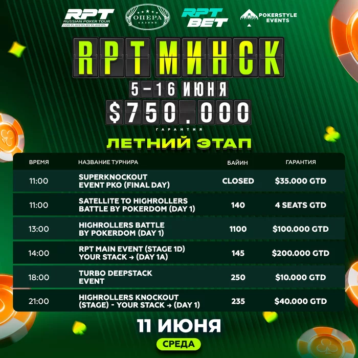 📣 Открыта регистрация $145 RPT Main event (Stage 1D) — your stack — day 1A. 20% участников пронесут свои стеки в день 1А главного события.