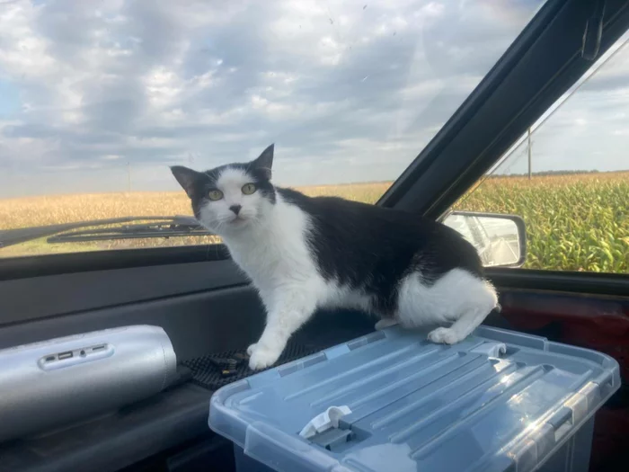 Доехали в этот раз практически без происшествий, если не считать того, что около пяти раз останавливались долить воды в бачок системы охлаждения, потому что где-то образовалась протечка и машина сильно грелась. Котов мы везли в четырёх переносках. Двое мелких были в одной, трое сидели отдельно, каждый в своей переноске, а Мася, уже привыкшая к дальним поездкам, по привычке сидела у меня на коленях, и, время от времени, на коленях у Маши. К слову сказать, у нас четверо мелких котят до одного года, и двое взрослых, которым уже за 15 лет. И вот одна из них, по кличке Люлю, несколько раз проявляла какие-то гипер-агрессивные действия, выражаясь покерным языком, и сильно поцарапала и покусала руки Маши. Связано это скорее всего со стрессом. Взрослая кошка, находясь всю жизнь в одном месте, вдруг оказавшись в машине, где за окном мелькает дорога, логичным образом стрессанула. И даже Маша её не узнала, но чуть позже она слезла с рук Маши и, немного полазив по машине, успокоилась. Всё её недоумение можно прочитать по выражению её морды.
