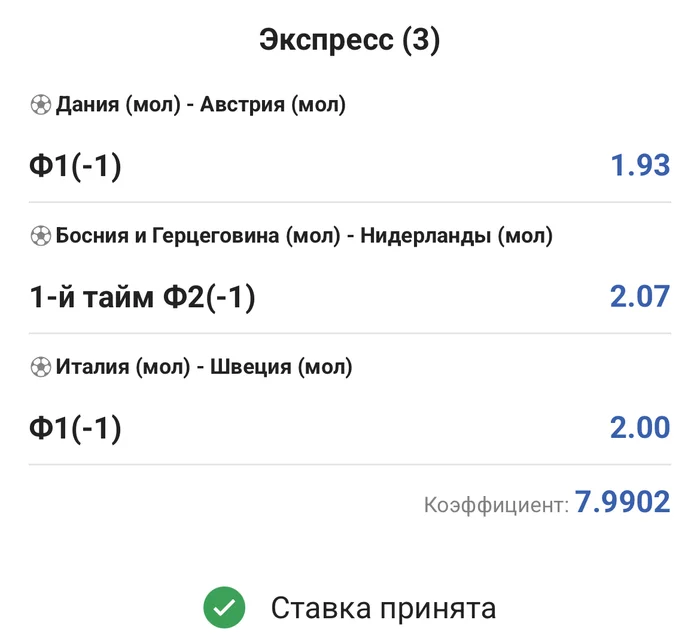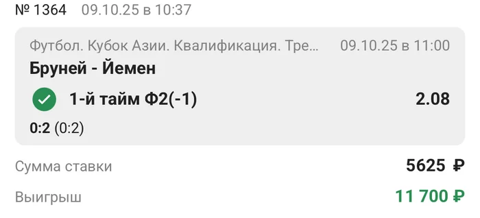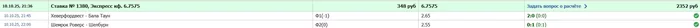 Результаты за вчера 10.10.25. 5 экспрессов проиграло, банк уменьшился на 1740 р, 2 экспресса в разгоне, итого за октябрь банк 85 287 р,-14,71%! Сумма справки на сегодня составит 324₽! 3 двойника проиграло, итого -6786₽ , итого банк 83 640 р, сумма ставки на сегодня составит 2086₽.