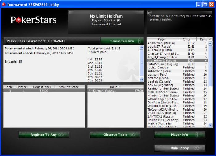 Poker Stars $0.25+$0.00 No Limit Hold'em Tournament - t75/t150 Blinds - 7 players - View hand 1202060