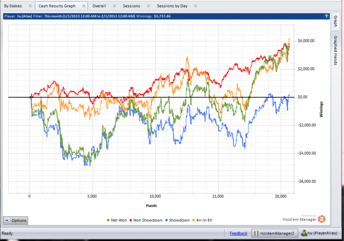 Январь был сложный. После карпат, потерял игру и уверенность + по пизде пошли все анти тилтовые наработки. В начале много проиграл на нл400 (около 6к), 70% грубые технические ошибки, связанные с тилтом. Покер не в том состоянии, что бы так дорого сжигать деньги. Всего отыграл дней 10-12. Было много дней, когда выгодней было не играть в покер, а заниматься спортом, смотреть воды или тупо играть в доту. Подтянул игру на 5-6 макс столах, с селектом, на небольшом кол-ве столов могу бить нл200/нл400. СНГ не играл, сорри парни :) Штук 10 МТТ сыграл со ср байином 100$. Оч удачно складывается начальная/средняя стадия, но в алынах на предфиналках не везёт.