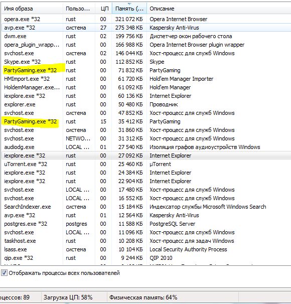 нижний крякаю и клиент нормально продолжает работать, исолняемый файл один PartyGaming.exe, процесса два ^_^. Если не удалить, то потом через часа два картинка выше возникает. Стоит КИС 11, базы обновленные, проверку сейчас делаю, может чего найдет