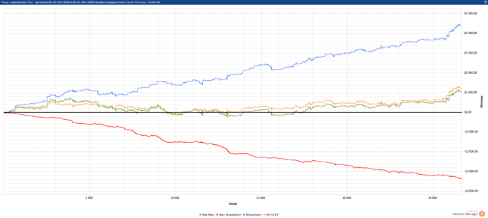 Че то руки никак не доходили сделать отчетик.) Скажу что в декабре-январе была апатия к покеру, но потом курс вырос и катать стало очень привлектально + я ходил на курсы скорочтения что заставляло мой мозг работать. Про курсы могу сказать, что надо еще после них задрачивать самому пол года и будет норм эффект, но я пока с этим еще не собрался. За то вот купил себе электронную книжечку и буду читать когда приеду в Тай :) Февраль катал плотненько, делал ошибки, мало работал над игрой но это больше чем было за все время.