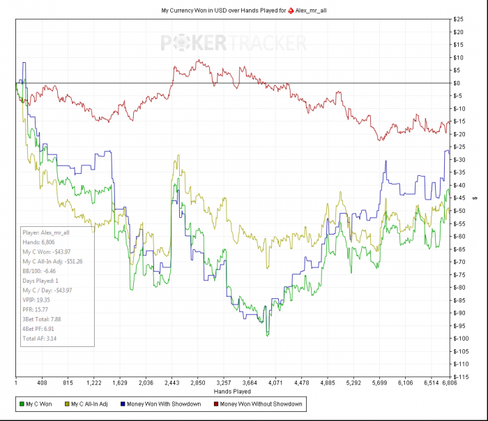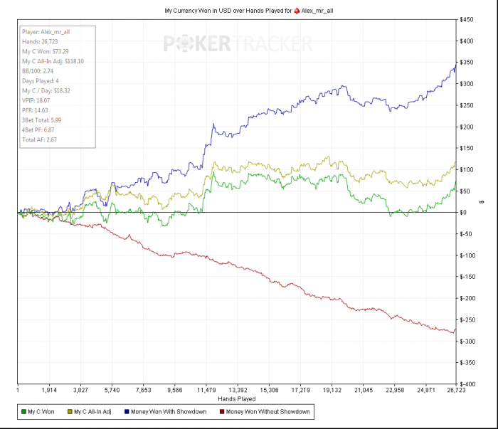 Трибетить - это круто. Но гораздо круче 4бетить. Я прям чувствую, как начинаю бесить регов) Меня начали обзывать ослом, придурком и геем) А еще я стал активнее заглядывать в попап. Пускай я еще точно не знаю, как оперировать всеми этими цифрами, но можно сказать, что вот такие заглядывания приносят бабло. Теперь я думаю, что пора бы разобраться с впипом и пфр. Да, я знаю, что если эти показатели 9/7, то человек нит, если 85/75, то человек долбоеб, но совершено не представляю какой диапазон карт включают в себя эти 9%. Надо с этим разобраться) Я заметил, что люди на нл10 ну вообще не скидывают на кбет. А я скидывал, до недавнего времени... Теперь же хуй вы меня кбетом выбьете))) В общем, такими размышлениями я пришел к выводу, что кнопка фолд очень интересный предмет, иногда ее нужно нажимать, а иногда нет.