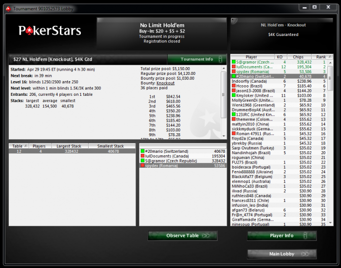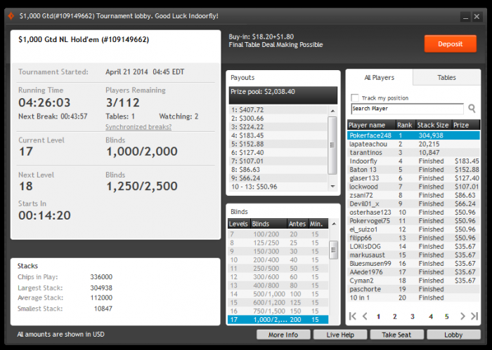 На ПС тоже типа плюс, но вместо финалки такая вот засада - 12/850 Poker Stars, $5 Buy-in (4,000/8,000 blinds, 800 ante) No Limit Hold'em Tournament, 6 Players Poker Tools Powered By Holdem Manager - The Ultimate Poker Software Suite.