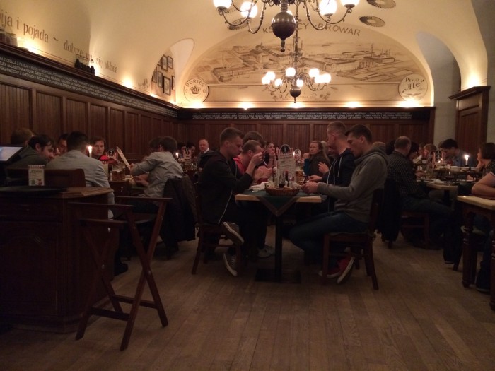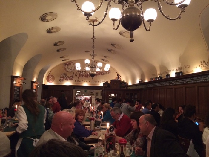 Наши души желали праздника, а желудки вкусной еды и алкоголя. Судьба и старинная Краковская мостовая привели нас в заведение "Под Вавелем" (Вавель- Королевский Дворец). В ожидании удовлетворения потребностей нижней ступени пирамиды Маслоу столика мы промучались минут 10. Негативным моментом был ответ администратора, что "не получится у вас, барышня, статусы поменять во всех соцсетях, тк интернет у нас не подают, а следовательно извольте вкушать пиво пищу под неторопливые беседы с друзьями но без чек- ина и прочего".