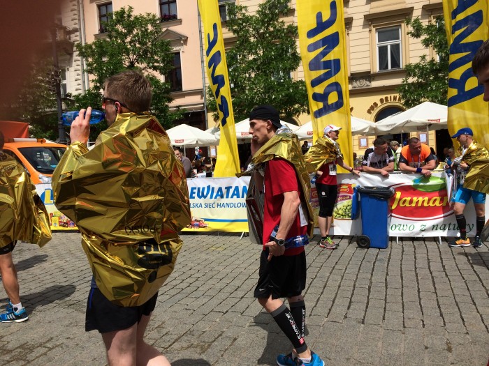 В тот день в Кракове проходил очень масштабный (судя по кол-ву участников) марафон. Никогда раньше не бывала, и тем более не участвовала в таких событиях. Финишировавшие участники марафона, укутывались вот в такие блестяшки, чтоб не переохладиться: