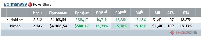 Ну что я могу сказать про вчерашний день так - это 1) Играл может быть я не плохо , но в некоторых ситуациях играл отвратительно . 2) Да вчера переезжали меня не спорю , но это не повод на то что бы ныть , ведь переезжать и я буду что соотносительно ) 3) Так как я не могу пробраться выше на лимиты (а это знак что у меня лик в игре ) Я упрощаю ситуацию и делаю более выгодной игру для себя . 4) Не много почитав теории , форумы и т.д решыл прочитать книгу "kill everyone" которая позволит набить руку в пуш-фолде . 5) Ведь что бы заработать деньги нужно трудиться , по-этому буду играть 1$снг на 45 человек БР=112$ (112 Баинов на этот формат турнира) играть буду в соотношении если : а) Бр упадет до 50$ , переходу на 0.25 на 45 человек . б) если поднимусь до 200 начну подключать новый формат 1-180. Это будет моей первой целью закрепиться на лимите ну и побить его соотвественно . Жалко что мой хм виснет и я не могу кинуть пару спорных роздач которые нужно было бы обсудить . В день думаю буду играть от 6часов игры ну и 50+ турниров , что бы не много снизить и кол-во и дисперсию . В дальнейшем буду каждый день именно так публиковать . Сегодня день 1-й
