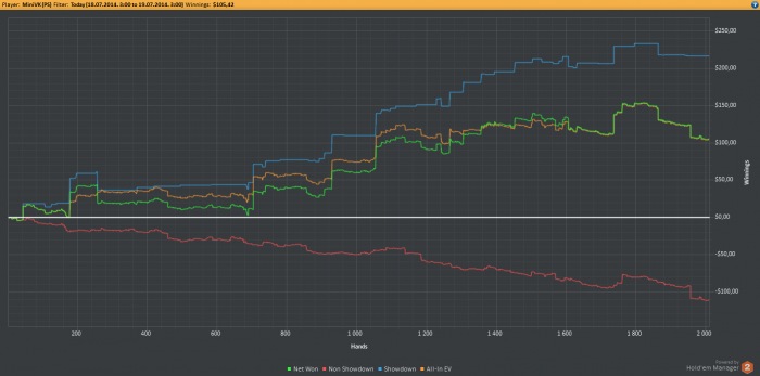 Общий минус на нл10 в этом месяцу на дистанции в 30к рук достиг уже -253.33, в то время как по EV -167.63 Так как нл10 я катал якобы "для восстановления ауры" или же можно сказать "пережидал стрик", я понял что пережидание может стоить мне всех денег )) Вообще не понимаю этот лимит, откатал на нем порядка 250к рук, какой-то зверинец. БР мне конечно потрепало, но тем не менее, для того чтобы катать нл25 всего хватает.