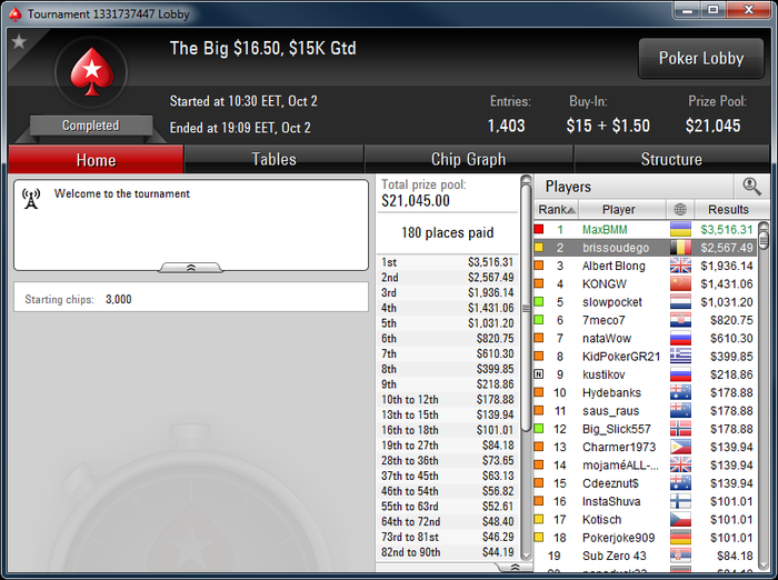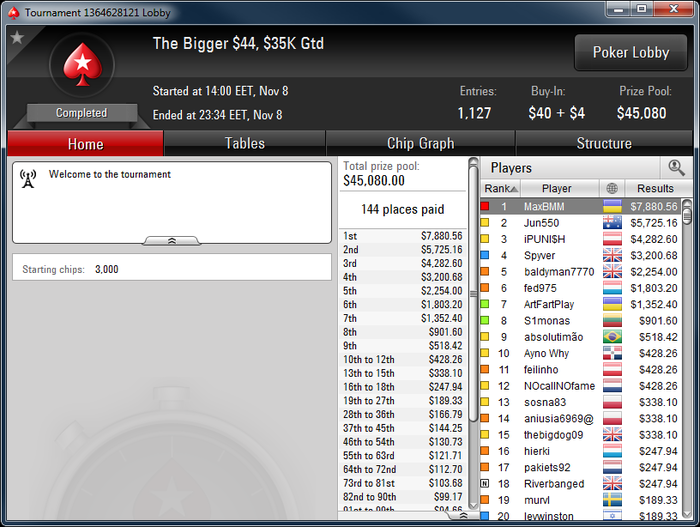 В 4мкс хотели поделить, мне как самому короткому полагалось чуть больше,чем за топ3. Но чиплидер отказался и слетел 4ым А я в итоге затащил Еще взял два топ1 на Айпокере( на 800Е суммарно), топ3 в Тайфуне, два топ 2 (260$ и 330Е) на 888 и Микро Вобщем бестдей онлайн в этом году