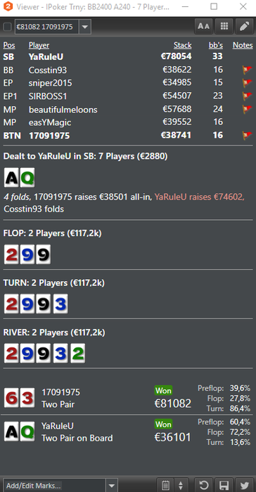 Tournament #74739800 $10.90 + $1.10 - Table #23 9 Max (Real Money)