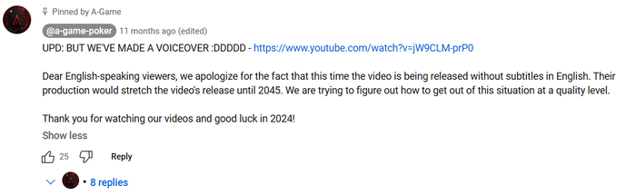 Дело в том, что к тому моменту я уже год как самостоятельно писал английские субтитры для наших видео на А-Гейм. Западные партнёры каждый раз очень просили, но это было ОЧЕНЬ трудозатратно (я буквально ставил видео на скорость 0.25 и набирал руками русский текст, который потом переводил на английский и посекундно забивал уже отредактированные английские субтитры обратно в Ютуб). Любые автоматические облегчители этого процесса не работали от слова совсем, потому что нейросети 2024 года всё еще распозновали слово контбет как слово крокодайл. А теперь представьте таким образом обработать трёхчасовые итоги года. Вспоминая те времена - я понимаю, что заслужил то, что имею теперь