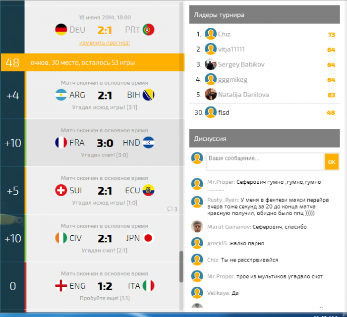 flsd @ 16.6.2014 Насколько я понял, в том конкурсе прогнозов, который опубликовал гранмастер, выиграть невозможно. Играют бабы Ванги и Нострадамусы, которые угадали почти все счета :))