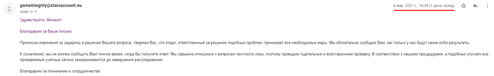 Спустя час я получаю ответное письмо, в котором надеюсь получить больше инфы по этому вопросу