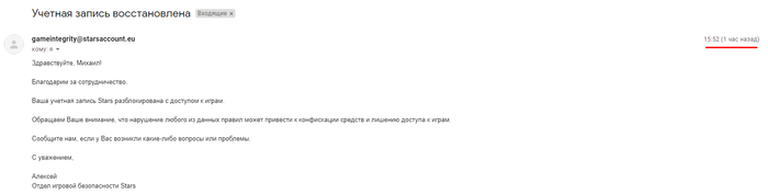 Но чуть позже я, наоборот, посчитал это правильным решением, и выражаю респект этому человеку. Условно, когда кто-то заявляет, что владеет "запрещенкой", всегда лучше перестраховаться. Мне сложно понять мотивы этого человека, так как, скажу честно, заявлять об этом куда-то не стану. Но какими бы его мотивы не были - из благих ли побуждений ради честной игры, или чисто хейтерских - я сам поставил себя под удар, за что и понес ответственность. Учетка заморожена, идет разбирательство
