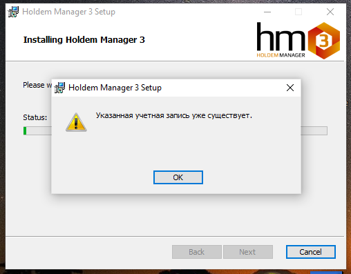 Добрый день, подскажите, как решить проблему при установке ХМ3 выскакивает " Указанная учетная запись уже существует".