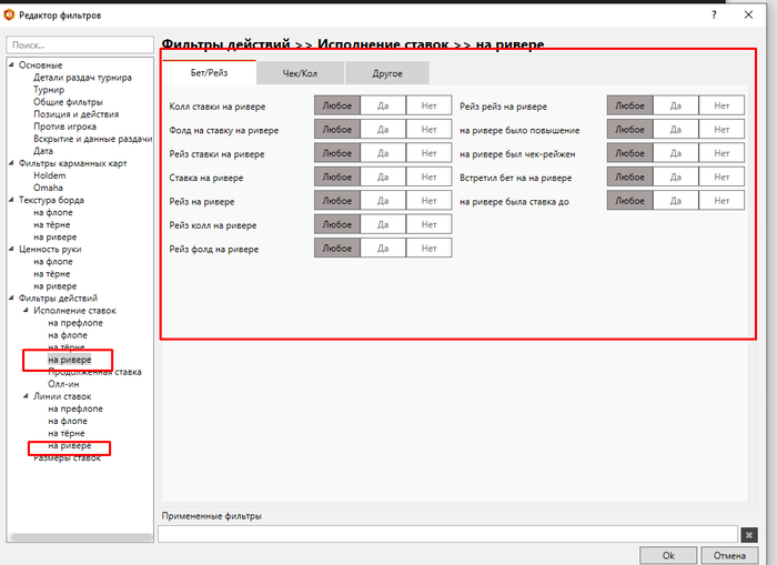 Подскажите какой сделать фильтр чтоб посмотреть все руки где я делал кол на ривере ?