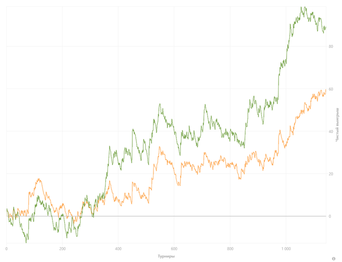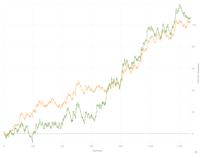 Кстати, я в айпокере в "небьющихся" тоже имел фишки с турнира, позволяющие катать их в плюс пре-РБ, причём в стартовых стеках 5бб. Но там дистанция была чуть побольше - около полумиллиона турниров.