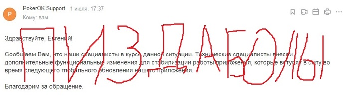 Если баланс не пополнился в течение 30 минут, напишите в саппорт и предоставьте чек (где будет видна сумма, время и получатель). Cвязаться со службой поддержки ПокерОК можно: