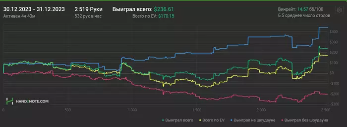 31/12/2023: 4.43ч, 2519 рук nl100 +$220.