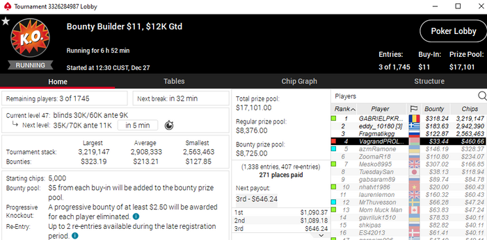 Кстати по итогу выиграл чел, который сделал пас, оставив себе 3 бб из стека 15 от недопуша, когда я зарепушил и за мной чел запушил с баунти 400 ( я его выбил).