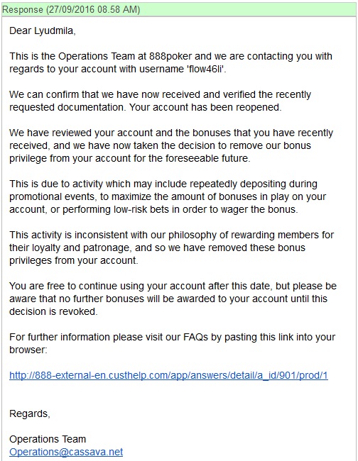 Зарегистрировалась на 888, 22 сентября внесла депозит, начала играть в покер. Сделала еще несколько депозитов под казиношные бонусы. Вместе с покером начала играть и в казино. 25 сентября поставила деньги на вывод. 26 сентября пришло сообщение, что аккаунт заблокирован, нужно загрузить нотариальные копии документов. Загрузила. 27 сентября пришло сообщение, что аккаунт разблокирован, но все бонусы отключены.