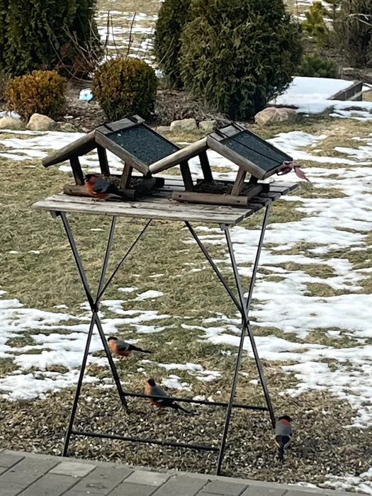 снегири толстые, жадные. Подлетает синица - они тут же ее прогоняют.