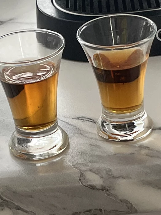 В одной рюмке коньяк из бутылки, в другой - после двух недель во фляжке.