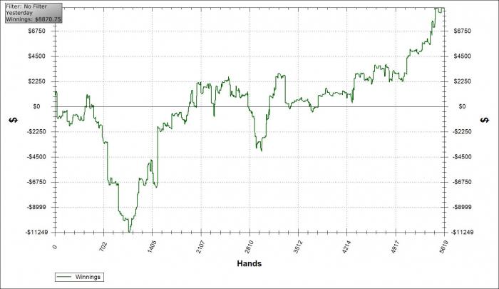 Это у сильных игроков такая ситуация возникает при переходе на лимит выше. Для тильтового рейкбота вроде меня достаточно просто неудачного начала сессии даже на родном лимите. Например, сидишь, целый час дисциплинированно выкидываешь на терне/ривере, потом открываешь ХМ, с ужасом смотришь на обвалившуюся вертикально вниз красную линию и начинаешь инста колить любое количество баррелей, любые рейзы на любое количество бб на любой доске с любым шд велью. Причем все коллы строго обоснованы, примеры обоснований: "ну, тут он блефует по-любому", "я не могу скинуть топ-пару против этой обезьяны", "не могут же этим моронам так часто натсы заходить, мне ведь уже вторую сессию ничего не заходит, б.., там снова фулл", "он не мог так по-идиотски разыграть сет, поэтому сета у него нет, он блефует ... б...., у него сет.", "он ставит много на 4стрит 3 флеш доске, у меня second pair, у меня пот-оддсы всего-то 30%, это плюсовый колл, б..., там 2 пары, какого х... он вельюбетит 2 пары на такой доске!". Залив таким образом еще пару-тройку стеков, думаешь "что же я творю, б...." и в тильте закрываешь все столы одной кнопкой, благо тейблниндзя предоставляет такую возможность.