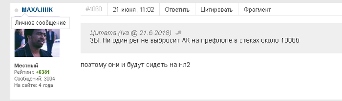 я говорил о том, что многие "реги" нл2, да и того же нл10 совершают чудовищные ошибки на префлопе со своими АК. То же самое они делают, совершая колд коллы 3бетов. В этом случае они не понимают, что капнуты в жопу процентах в 90% случаев и что против человека, у которого в штанах что-то есть-они утпо получат 3 банки и обосрутся коллировать со своими JJ